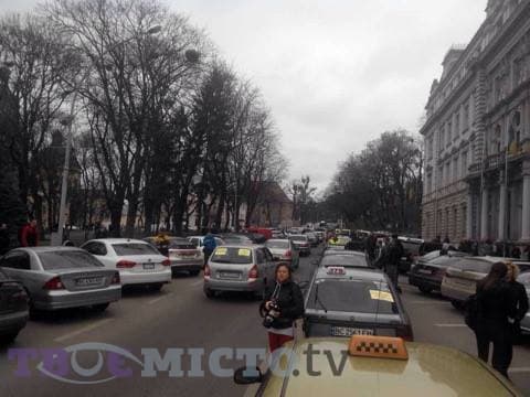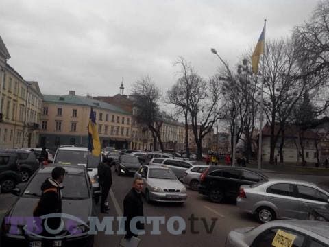 Як інформує кореспондент Tvoemisto.tv з місця події, зараз автомобілі локалізуються по правий бік на вулиці Винниченка під Львівською облдержадміністрацією: машини розміщуються в один ряд у напрямку руху до Високого Замку.