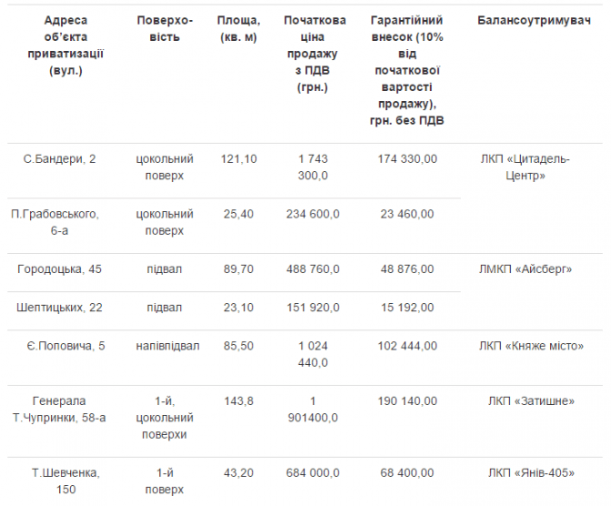 Управління комунальної власності Львівської міської ради виставило на продаж з аукціону сім приміщень.