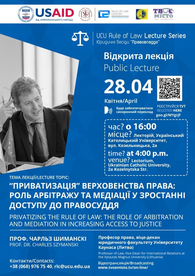 Черговий чотирнадцятий захід від UCU Rule of Law Lecture Series відбудеться 28 квітня (п’ятниця) 2017 р., о 16:00 у лекторії Академічного корпусу Українського Католицького Університету за адресою м. Львів, вул. Козельницька, 2а в рамках відкритої лекції професора права, віце-декана юридичного факультету Університету Каунаса Чарльза Шиманскі (Литва) на тему: "Приватизація" верховенства права: роль арбітражу та медіації у зростанні доступу до правосуддя.