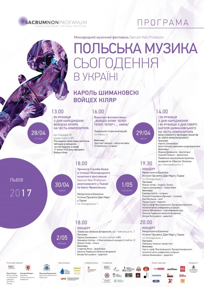 До 3 травня 2017 року в Україні відбудеться Міжнародний музичний фестиваль Sacrum Non Profanum. Подія, яка відбувається вже в тринадцяте, цього року матиме два відкриття – навесні у Львові та Івано-Франківську, а також влітку – в Берліні, Щецині та прибалтійському Тшенсачі. Ця шанована музична подія у нас пройде під гаслом «Польська музика Сьогодення в Україні – Кароль Шимановскі та Войцех Кіляр». А вже під час серпневих концертів – у Берліні, Щецині та приморському Тшенсачі – публіка аплодуватиме, зокрема, творам прекрасного польського композитора Анджея Пануфніка, інтерпретованим всесвітньо знаними і популярними виконавцями.