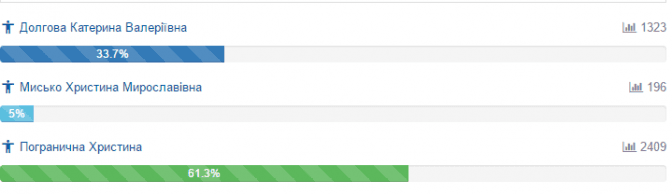 Голосування стартувало 4-го квітня, і вже завтра стане відомо, хто переміг. Зараз у голосуванні лідирує юна львівська гімнастка Погранична Христина. За неї проголосувало 61,3% львів’ян. На другому місці – мама-вихователь дитячого будинку сімейного типу Долгова Катерина Валеріївна. Її підтримало 33,7% жителів міста. 5% львів’ян проголосували за суддю Галицького районного суду м. Львова Мисько Христину Мирославівну.