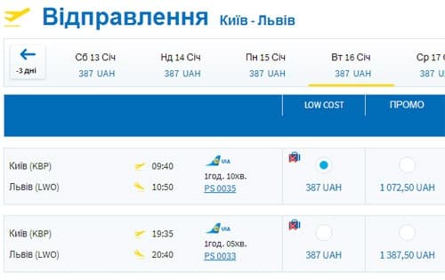 Приклад пошуку авіаквитків Київ-Львів: