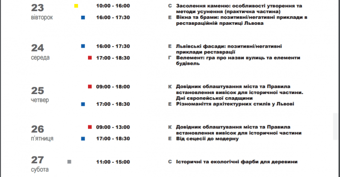 У форматі презентацій, екскурсій, воркшопів та квестів підніматимуться питання візуального образу міста, говоритимуть про стилі в архітектурі, позитивні та негативні приклади в реставраційній практиці міста, розробку та впровадження документів, які регулюють опорядкування фасадів, розміщення вивісок тощо, зазначають в Інституті міста.
