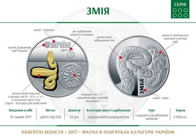 На аверсі монети у центрі розміщено позолочений перстень у вигляді змії ІІ ‒ ІІІ ст. н. е. із античного міста Тіра (зараз – Білгород-Дністровський). Праворуч відтворено змійовик ХІІ століття – нашийний двосторонній медальйон, який у Київській Русі був популярним різновидом оберегу з зображеннями християнського сюжету з одного боку та голови Медузи Горгони зі зміями – з іншого. Про це повідомляє Музей грошей Національного банку України.