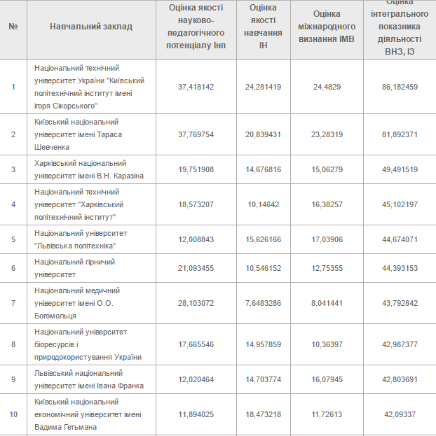 Вихідні дані для визначення вказаного рейтингу були надані безпосередньо університетами та отримані з незалежних Web-ресурсів.