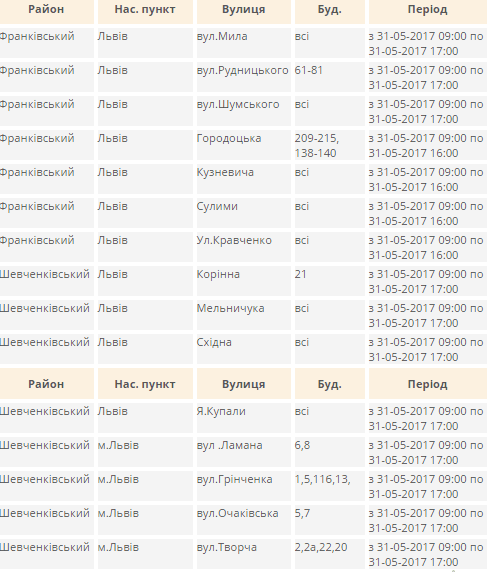 Завтра, 31-го травня, ПАТ «Львівобленерго» продовжить планові ремонтні роботи електрообладнання. Тож частина будинків у місті залишиться без електроенергії. Tvoemisto.tv пропонує їхній перелік.