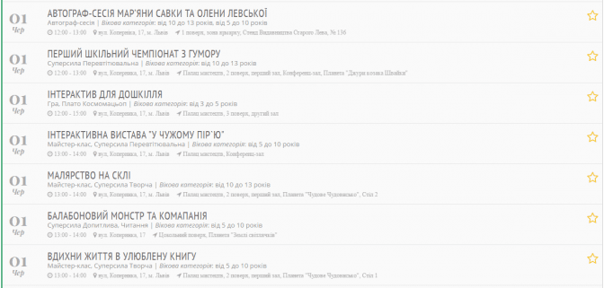 Ярмарок дитячих книжок, ігор та іграшок (понад 30 учасників, в т.ч. понад 20 видавництв дитячої літератури). Книжкові новинки за видавничими цінами представлять найвідоміші українські дитячі видавництва , зокрема: