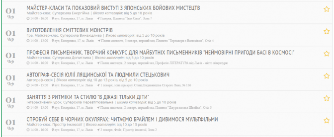 Заходи діляться за віковою категорією: • 3 – 4 років • 5 – 8 років • 9 – 14 років На Дитячому Форумі будуть представлені 9 тематичних просторів, присвячених різним видам діяльності, які поєднані в одну велику захопливу гру по врятуванню Всесвіту Просторова гра-квест «КОСМОВІЗІЯ: супергерої та книжкова туманність» За легендою діти рушають в космічну мандрівку. У відкритому космосі вони зустрічаються з проблемою космічного сміття, яке заполонило майже всю галактику. Отже, діти отримують особливу місію, для виконання якої їм необхідно буде набути нових суперзнань...