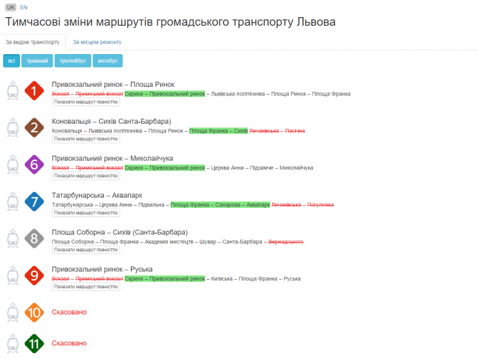 «На сайті відображено лише ті маршрути, у яких є якісь зміни. Маршрути можна переглядати за видами транспорту чи за вулицями, які ремонтуються. Є також англомовна версія, що має трохи полегшити життя іноземним туристам. Маємо сподівання, що цей сервіс допоможе львів’янам та гостям міста отримувати актуальну інформацію про зміни маршрутів трамваїв, тролейбусів та автобусів під час ремонтних робіт у місті», – прокоментував Олександр Шутюк.