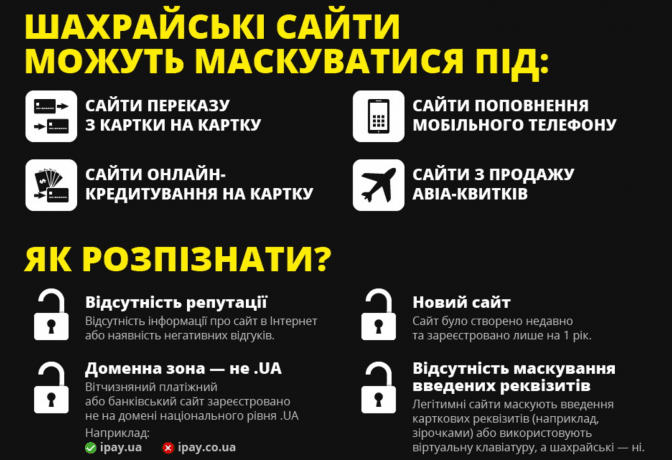 Найбільш поширеним способом шахрайства є фішингові сайти, які під виглядом інтернет-магазинів чи інших інструментів для грошових переказів пропонують ввести дані платіжних карток. В результаті реквізити карти опиняються у шахраїв. У 2015 році загалом в Україні таких сайтів виявлено 38, а у 2016 році — вже 178. Майже всі вони заблоковані кіберполіцією.