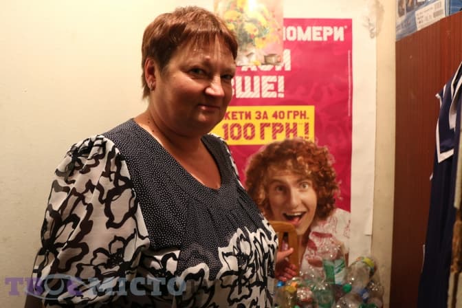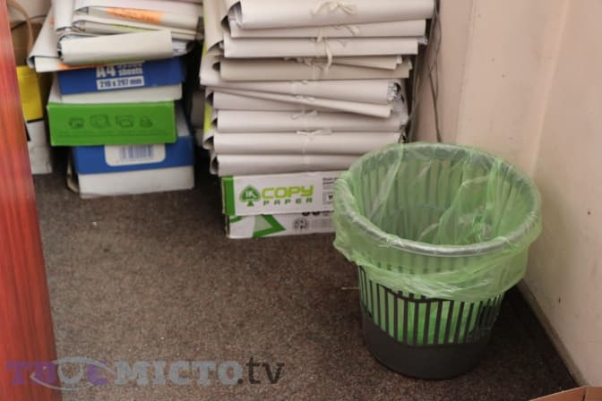 Прибиральниця службових приміщень Ярослава Паращич, яку всі тут кличуть пані Слава, приходить до Центру першою. Щоранку вона забирає сміття з кожного кабінету ще до приходу інших працівників. Її володіння – спеціальна комірчина, яку виділили для зберігання спресованих пляшок і паперу. «Приходжу о 6 годині ранку. До 9-ї вже встигаю все прибрати», – розповідає вона і показує маленьке приміщення, де тимчасово тримають макулатуру і пластик.