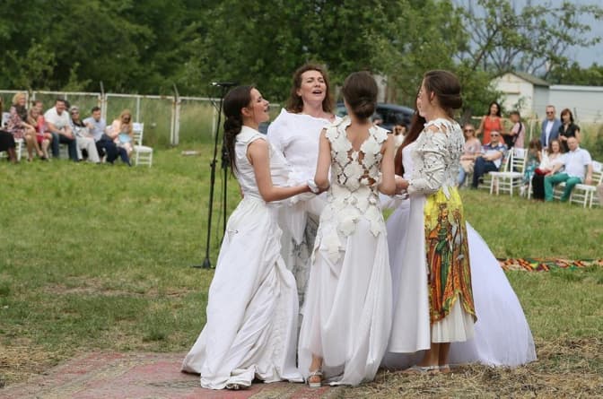 Акторки центру «Слово і голос» виконали українські весільні пісні, які підкреслили естетику колекції, що вирізнялася контрастним поєднанням сучасних принтів із зображеннями давнього побуту українців з самобутніми народними орнаментами.