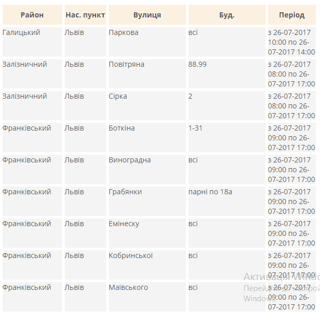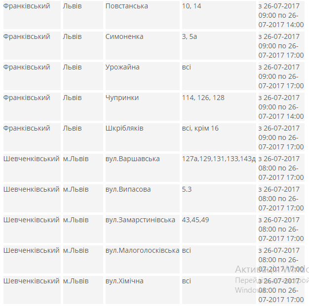 26-го липня планові відключення через ремонтні роботи будуть проводитися на кількох міських вулицях.