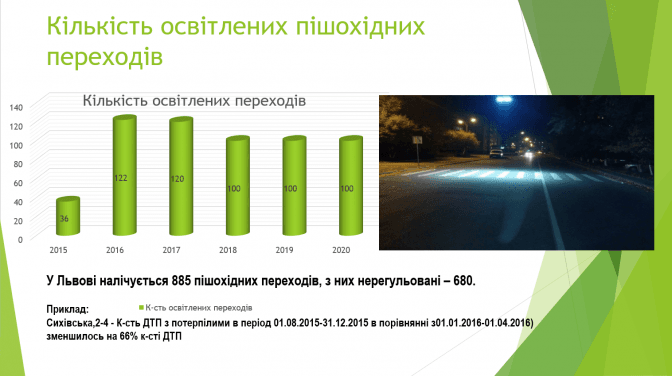 «На нерегульованих пішохідних переходах ми плануємо встановлювати підсвітку. З 2017 до 2020 року ми плануємо майже на 100% освітлити пішохідні нерегульовані переходи», – розповів він.