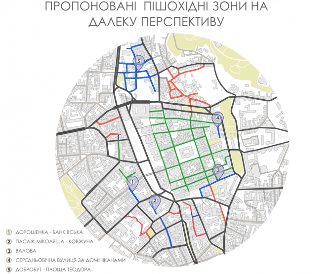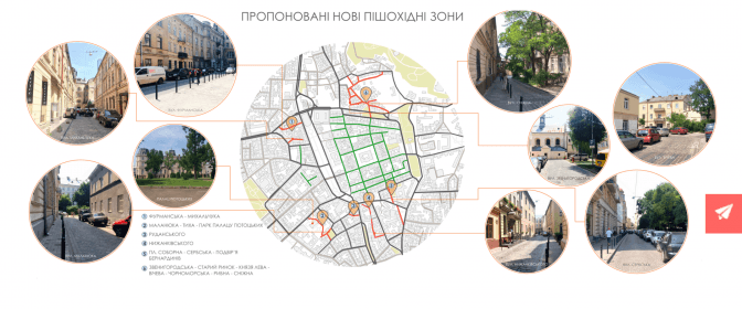 Тим часом у центрі виникне кілька нових пішохідних зон (на мапі позначені зеленим):