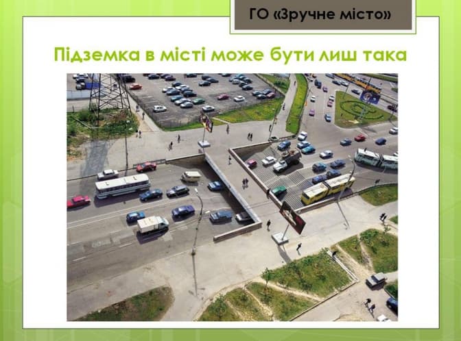 Члени ГО «Зручне місто» підготували інформаційний буклет, присвячений проблемі підземних переходів у містах, та опублікували його на своїй сторінці в мережі Facebook. На їхню думку, підземок слід позбутися, а натомість облаштовувати пішохідні переходи з розумними світлофорами.