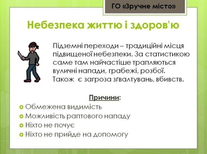 Підземні переходи є традиційним джерелом небезпеки. За статистикою там часто трапляються злочини.