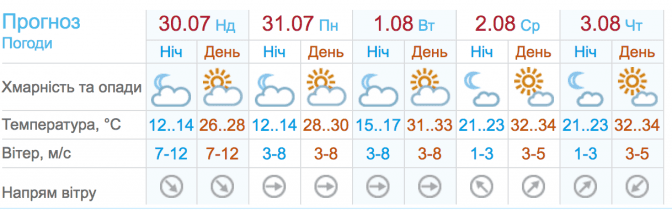 З неділі по четвер опадів не прогнозують. Від неділі денна температура зростатиме і триматиметься на рівні +32...+34 градуси. Нічна температура в найбільш жаркі дні становитиме до +23 градусів.