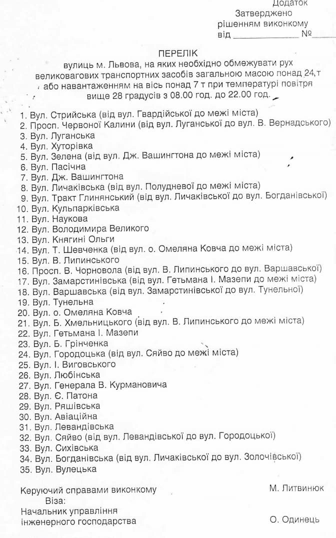 Уже визначено 35 вулиць Львова, де буде обмежено рух великовагових транспортних засобів загальною масою понад 24 тонн або навантаженням на вісь понад 7 тонн при температурі повітря вище 28 градусів з 08.00 год. до 22.00 год.