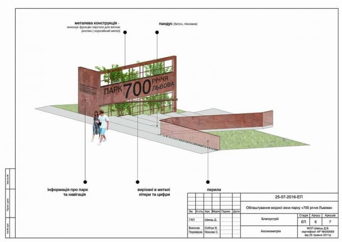 В парку планують облаштувати доріжку, сходи, пандус та металеву конструкцію, яка буде служити перголою для витих рослин. Таккож на металевій конструкції буде інформація про парк та навігація.