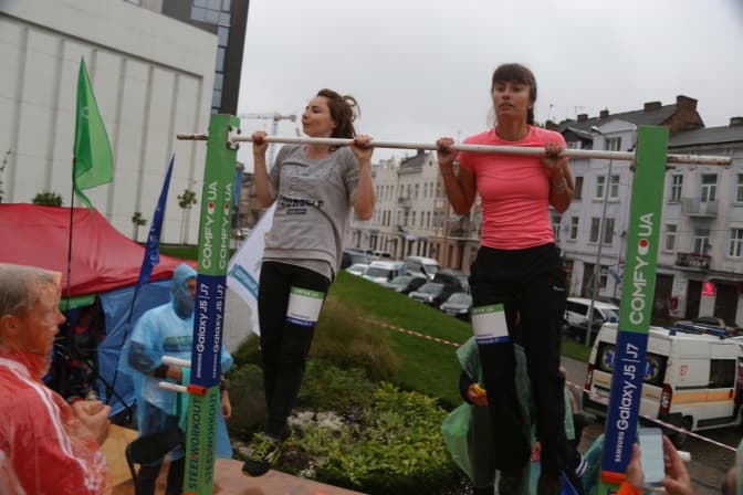 Натомість, жіночий норматив охоплював висіння на перекладині (15 с), відтискання від підлоги (10 разів), стільчик (30 с), бурпі (10 разів) та прес (підняття колін до плечей 15 разів). Аби здобути пальму першості, учасниці Людмилі Журавській знадобилось усього 1,44 хв.