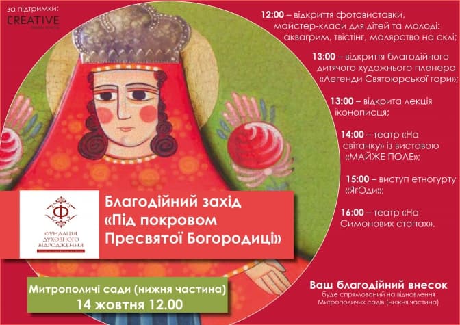 14 жовтня в Митрополичих садах відбудеться благодійний захід «Під покровом Пресвятої Богородиці», інформує прес-служба Фундації духовного відродження.