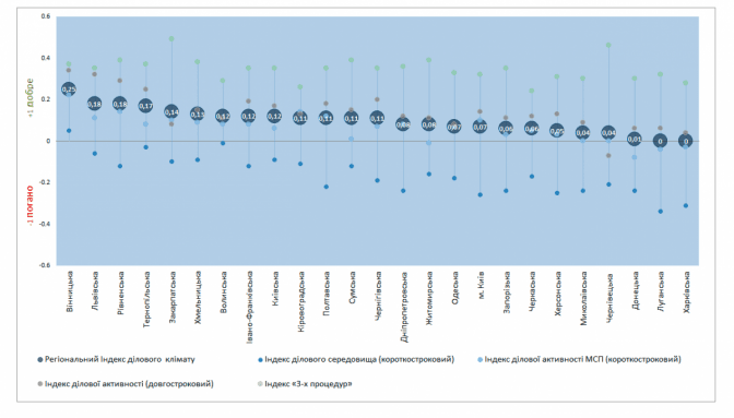Очолила рейтинг Вінницька область з результатом 0,25. Це єдина область України, де підприємці позитивно оцінили поточний стан ділового середовища. Із показником індексу 0,18 друге місце посіли Львівщина та Рівненщина з високим рівнем довгострокових очікувань. У топ-5 регіонів також потрапили Тернопільська й Закарпатська області.
