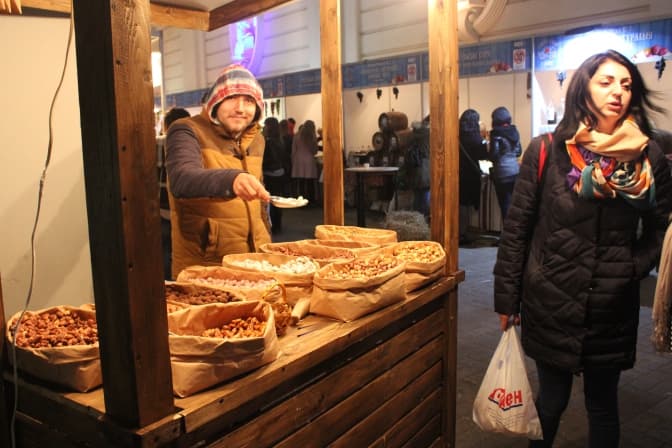 Чоловік мусив одягнути на себе весь одяг, що мав. «Я й не сподівався, що у Львові буде так холодно. В мене під Мукачевом тепло. Подивіться, як багато цього року вродило», – показує продавець на невеликі діжки та пляшки з вином.