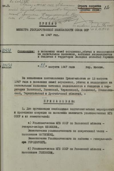21 жовтня 1947 року була проведена операція «Захід» з виселення майже 80 тисяч українців з території західних областей України. До роковин злочину Центр досліджень визвольного руху та Галузевий державний архів СБУ опублікували у вільному доступі на Електронному архіві Українського визвольного руху документи МГБ СРСР про планування та здійснення депортації.