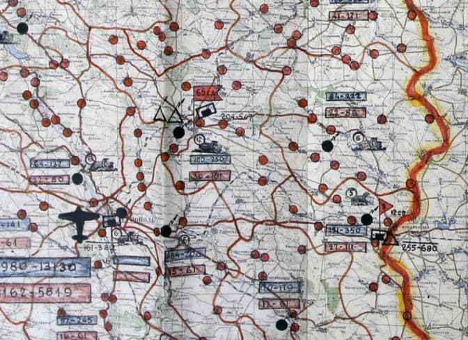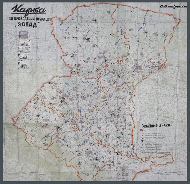 Фрагмент карти проведення операції «Захід» у Тернопільській області. Синій колір – кількість «контингенту» (осіб, які підлягають депортації). Червоний – кількість військовослужбовців, залучених до проведення депоратції. Жовтогарячі кружечки – місця дислокації оперативних груп військ МГБ.