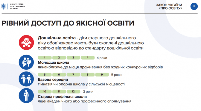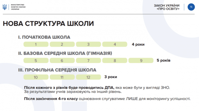 Нова структура загальної середньої школи. Початкова освіта (4 роки), базова середня освіта (5 років) та профільна середня освіта (3 роки). Загалом 12 років. Крім того, програми старшої школи можуть бути двох напрямків — академічне (поглиблене вивчення окремих «шкільних» предметів) і професійне (навчання, орієнтоване на ринок праці).