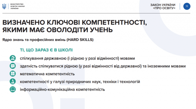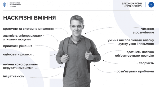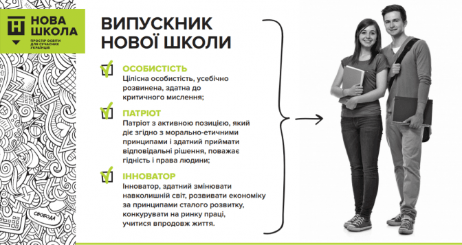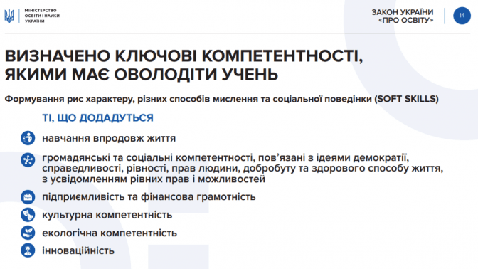 Додаткові компетентності, якими має володіти учень. Нова українська школа має розвивати у дітей «читання з розумінням, уміння висловлювати свою думку усно і письмово, критичне та системне мислення, здатність логічно обґрунтовувати позицію, творчість, ініціативність, вміння конструктивно керувати емоціями, оцінювати ризики і приймати рішення, вирішувати проблеми, здатність співпрацювати з іншими».