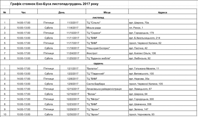 Кілька років містом курсує екобус, який збирає у мешканців люмінесцентні лампи, термометри і батарейки для подальшої переробки. Пропонуємо перелік локацій і графік стоянок у листопаді та грудні 2017-го року.