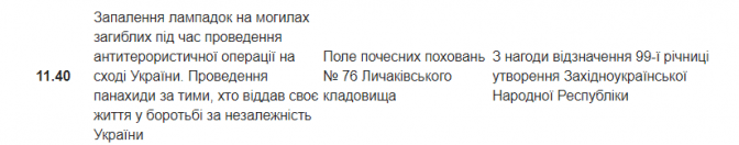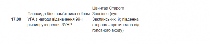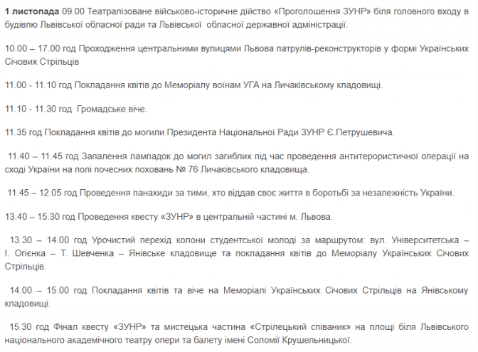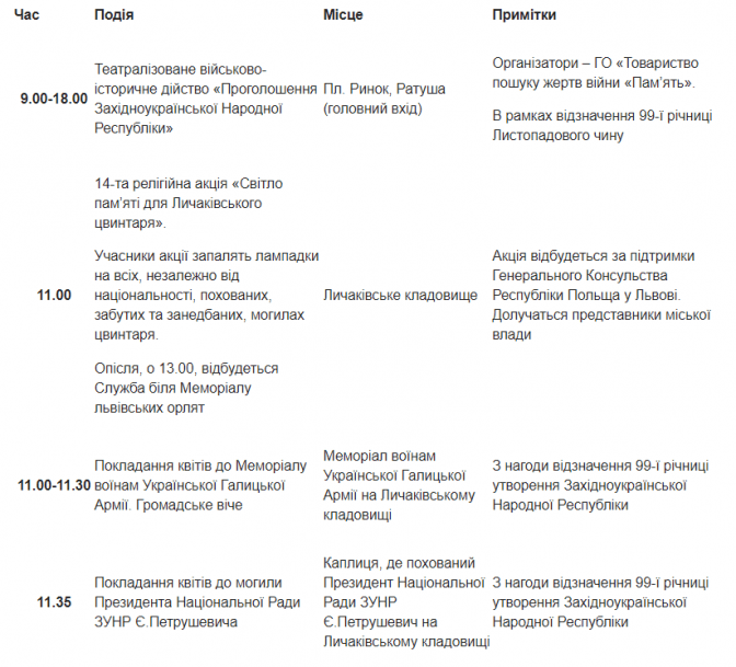 1-го листопада у Львові відзначатимуть 99 річницю Листопадового чину і проголошення Західноукраїнської Народної Республіки. У рамках урочистих заходів у місті влаштують пішу ходу від університету ім. Івана Франка до Меморіалу Українським Січовим Стрільцям. Там учасники ходи вшанують пам’ять борців за волю України: покладуть квіти, відбудеться панахида та громадське віче.