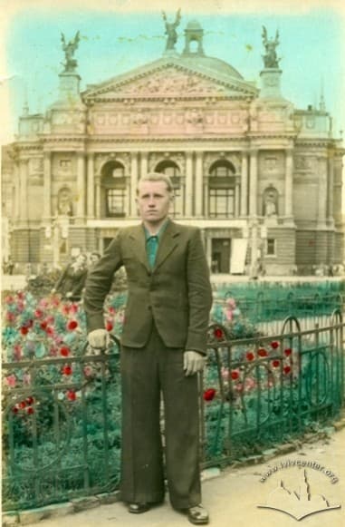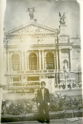 Віктор Ласаєв інженер Львівського науково-дослідного радіотехнічного інституту на фоні Оперного театру (на театрі афіша про гастролі Московського драматичного театру на Малой Бронной).