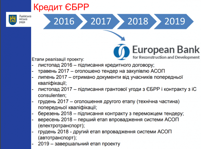 Нагадаємо, 17 листопада 2016 року у Львові підписали угоду щодо кредитного фінансування проекту автоматизованої системи оплати проїзду у громадському транспорті міста. Таким чином, Львів отримає від Європейського банку реконструкції та розвитку 10 млн євро на впровадження електронного квитка.