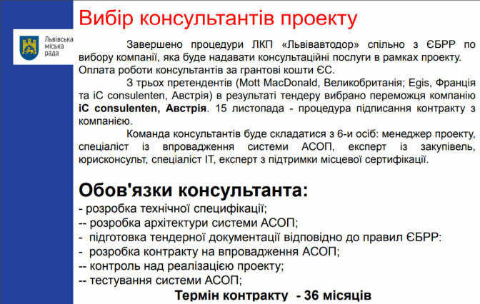 «Минулого року ми підписали угоду про залучення кредитних коштів для реалізації проекту автоматизованої системи оплати проїзду у громадському транспорті (АСОП). Оголосили перший етап відбору компаній, які претендують на впровадження електронного квитка у Львові. На сьогодні ми провели відбір компанії-консультанта. З трьох претендентів: (Mott MacDonald (Великобританія); Egis (Франція) та iC consulenten (Австрія), в результаті тендеру вибрано переможця – компанію iC consulenten (Австрія). Цю кампанію ми знаємо. Маємо хороший досвід співпраці з нею в інших проектах», – зазначив директор ЛКП «Львівавтодор» Олег Береза.