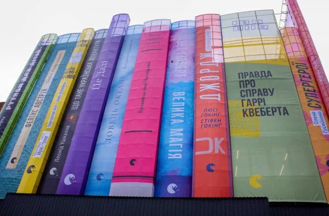 Зовнішній фасад будівлі нагадує полицю із книгами, які у різні роки видавали у видавництві.