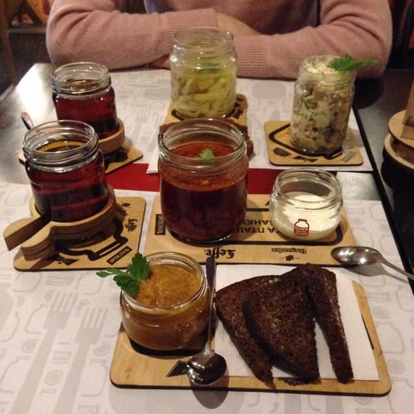 Що: Одна з найдемократичніших пропозицій бізнес-ланчу у Львові. Фішкою цього закладу є те, що тут усе подається в банках. Тож будьте готові, що ваші суп, салат, головне й напій принесуть не в тарілках.