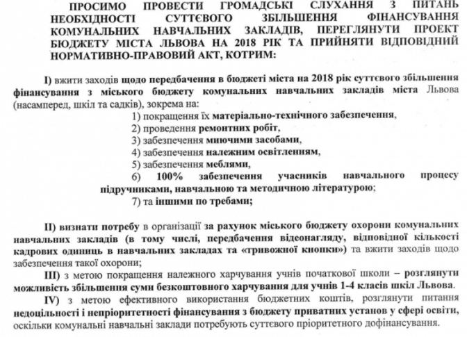 4 грудня 2017 року відбудеться громадське слухання щодо суттєвого збільшення фінансування з бюджету комунальних навчальних закладів міста Львова (насамперед шкіл та садків). Анонс опубліковано на сайті ЛМР. Ініціатором є ГО «Батьківська рада Львівщини».