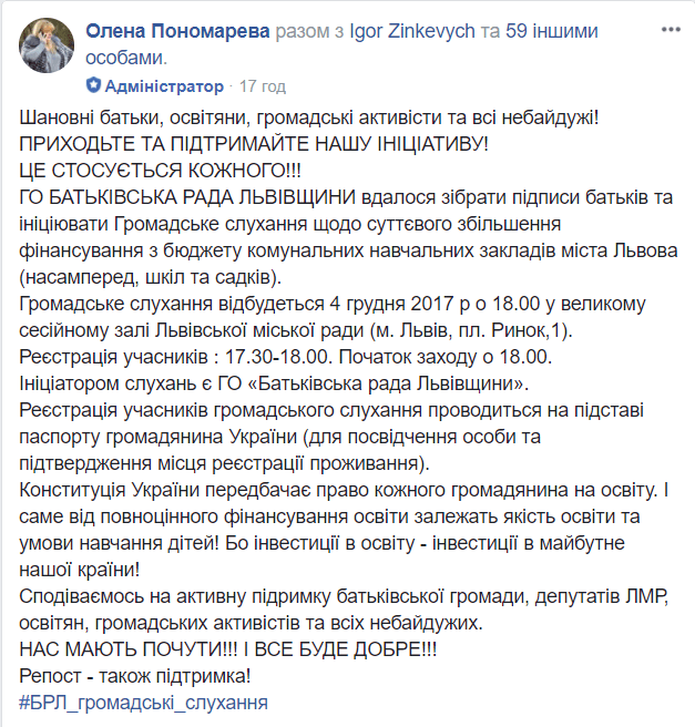 Голова ГО «Батьківська рада Львівщини» Олена Пономарева закликала батьків та небайдужих львів’ян долучитися до обговорення.