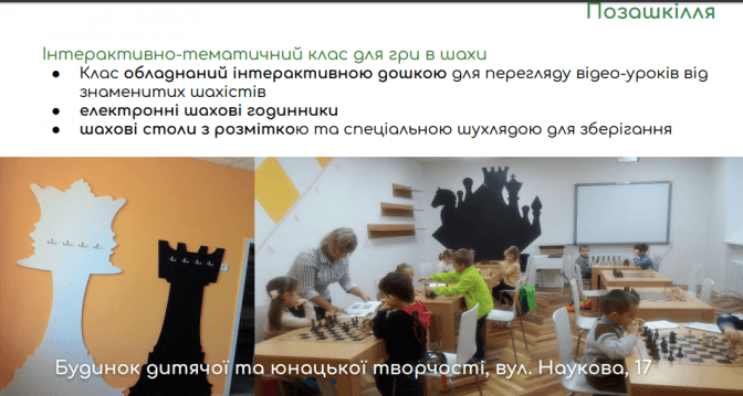 Як розповідає Шевців, у рамках проекту було оновлено приміщення гуртку шахів Будинку дитячо-юнацької творчості: встановили інтерактивне обладнанням, нові столи з вмонтованими шаховими досками, закупили таймери для гри.