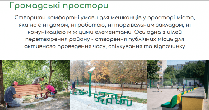 «Також в рамках проекту були облаштовані громадські простори: наприклад, на вулиці Пулюя відкрилася алея модерної скульптури Михайла Дзиндри. Там встановлене сучасне вуличне обладнання, комфортні вуличні меблі, і втому числі комплекти меблів, на яких є комплекти для гри в шахи та нарди», – додав Андрій Шевців.