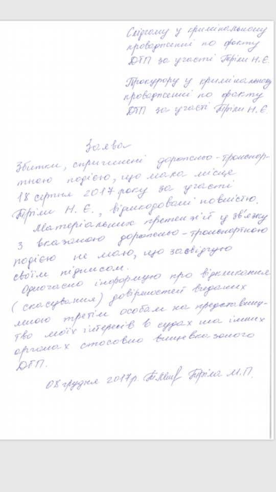 «Матеріальних претензій у зв’язку з вказаною ДТП не маю, що засвідчую своїм підписом», – йдеться у заяві. Також вона повідомила про відкликання довіреностей, виданих нею третім особам на представництво її інтересів в судах та інших органах стосовно вищевказаного ДТП.