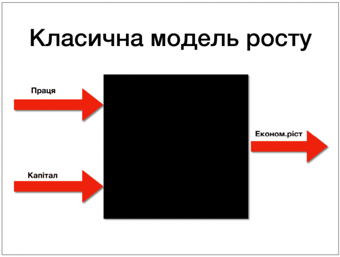 На слайді нижче – модель росту. Насправді нам відомо лише 50% того, що відбувається. На вході є праця і капітал, на виході – економічний ріст. У чорному квадраті – продуктивність використання праці й капіталу.