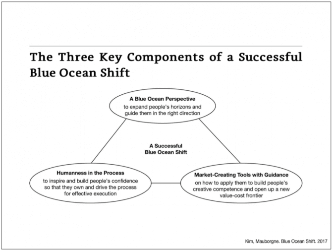 Автори стратегії блакитного океану професори Чан Кім і Рене Моборн із Малайзії говорять про «зсув реальності». Цей погляд новий, дещо суперечливий, не намацальний. Нижче у слайді йдеться про те, що для цього зсуву потрібно.