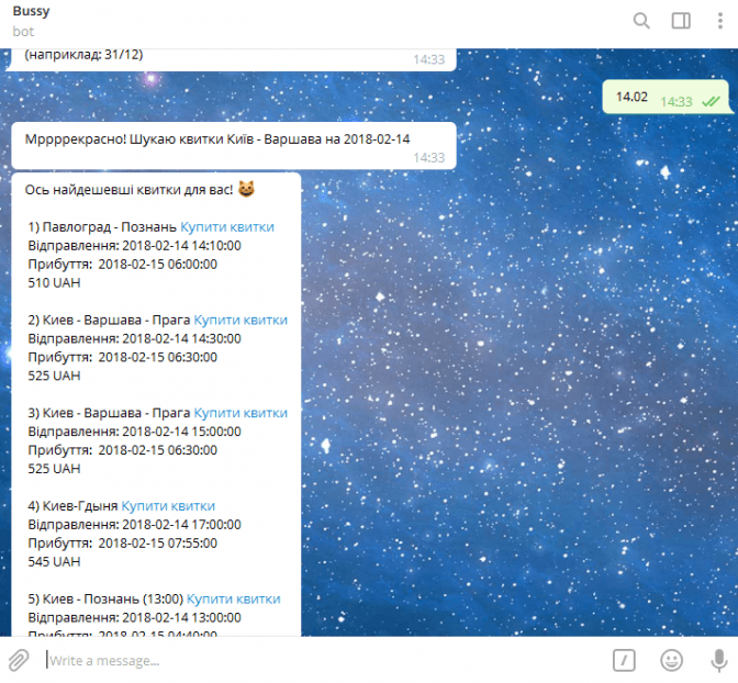 Для того, щоб почати користуватися ботом, необхідно ввести місто відправлення, місто прибуття та дату запланованої подорожі. Після цього бот підбере найбільш вигідні пропозиції та надішле посилання на сторінку бронювання квитків. Про це повідомляє ain.ua.