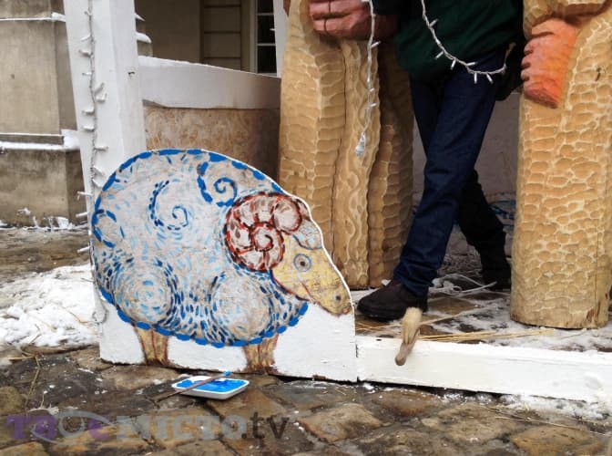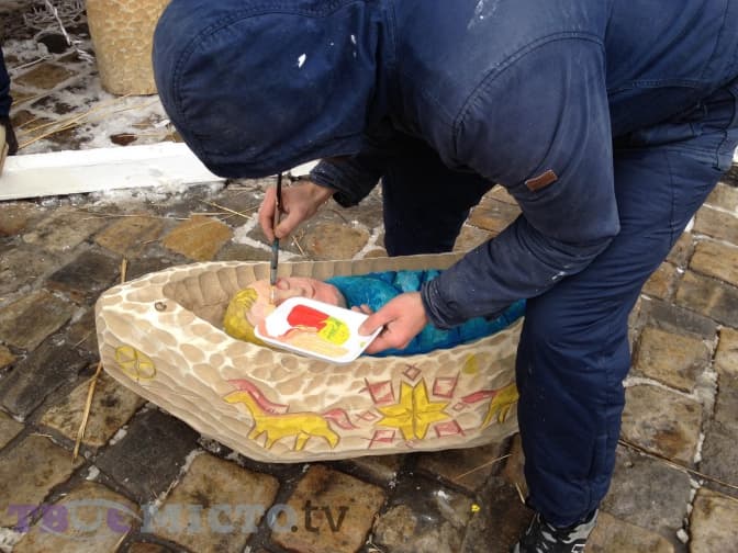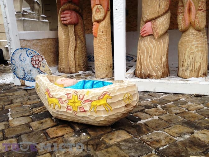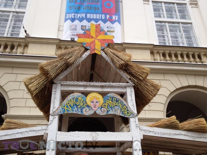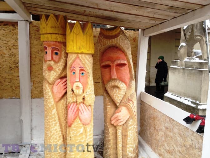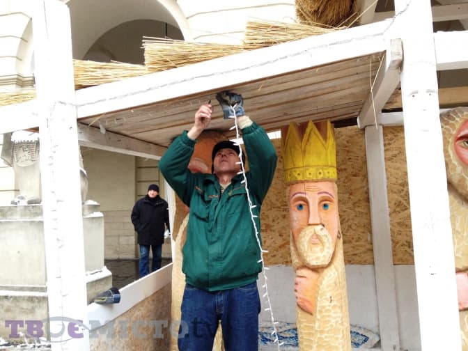 На площі Ринок перед входом у Ратушу встановлюють різдвяну шопку. Завершать роботи сьогодні, 21 грудня, орієнтовно о 18:00-19:00: о 17:00 мають привезти сіно, а також замінити деякі елементи, які зламали перехожі.
