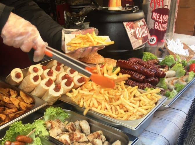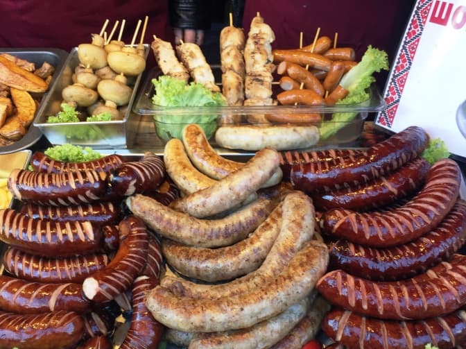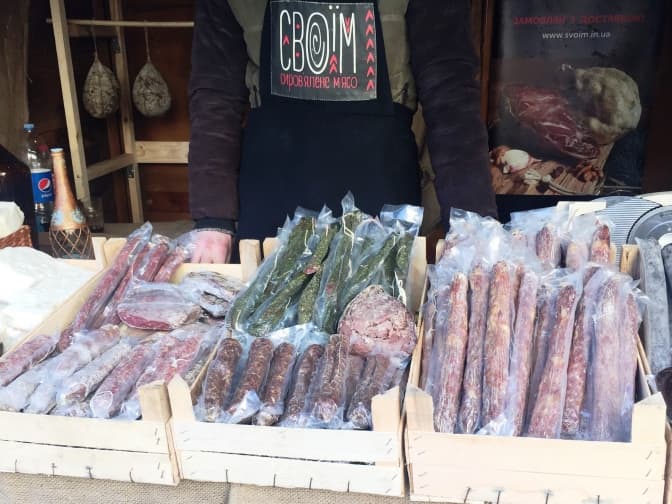 Різноманітні домашні страви є невід’ємним атрибутом кожної ярмарки. Придбати ковбаски можна за 30 грн (маленькі) та 50 грн (великі). Великий шматок шашлика зі свинини можна спробувати, віддавши 80-100 грн, а маленький, заплативши 40 грн.