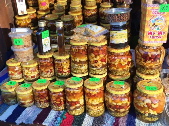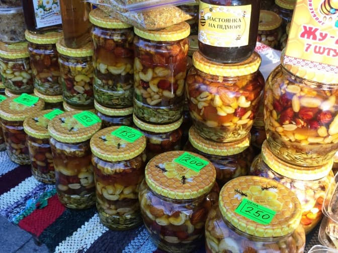 Арахіс, горішки, курага та мигдаль – і все це залите медом у невеличкі скляночки. Вартість такої смакоти коливається від 90 до 250 грн.